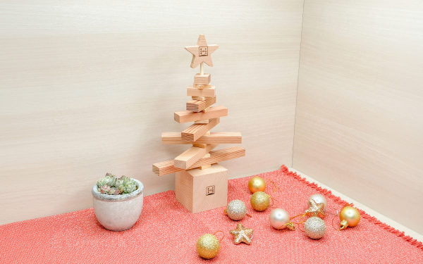 いくつもの木の部品を組み合わせて完成させる、クリスマスツリーの工作キットです。