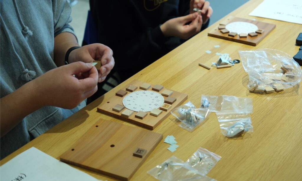 ワークショップでは、木目や色味がひとつひとつ異なるパーツの中からお好みのものを選び、素材ならではの個性を楽しみながら時計づくりを体験していただきました。